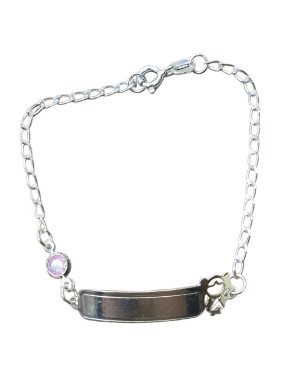 Pulseira infantil em prata 925 com chapa lisa e delicado pingente de menina. Uma joia suave e especial, perfeita para marcar momentos importantes como batizados, aniversários ou primeiras comunhões.