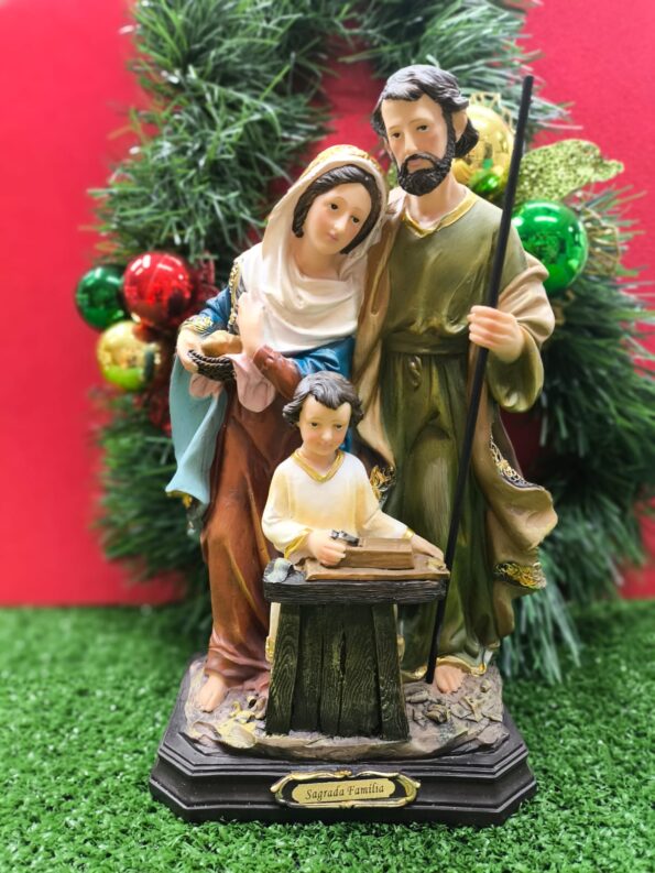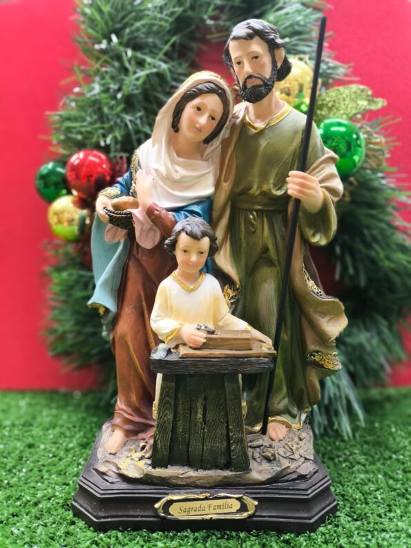 A imagem de Sagrada Família 30 cm em resina é ricamente detalhada, com pintura delicada e acabamento de qualidade, ideal para decorar ambientes, oratórios ou oferecer como presente especial.