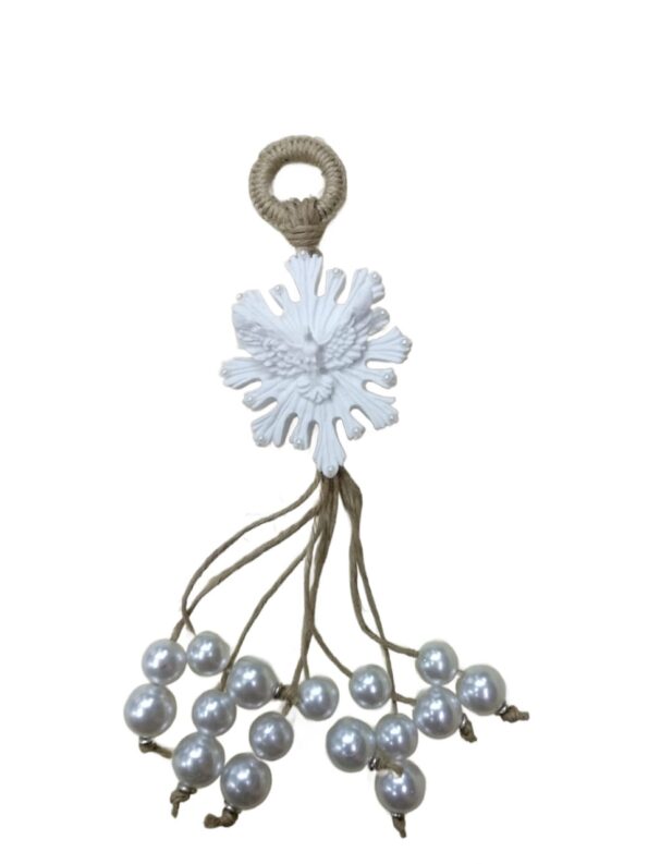 Este delicado adorno combina um pompom em rami com pérolas elegantes, apresentando uma imagem pequena e resplandecente do Divino Espírito Santo. Ideal para trazer um toque de espiritualidade e beleza ao seu ambiente, este item é perfeito para decorar ou presentear, simbolizando fé e proteção.