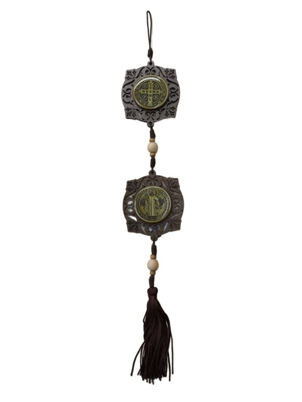 Este adorno de porta duplo, feito em MDF, traz a poderosa medalha de São Bento, símbolo de proteção contra o mal e bênçãos para o lar. Seu design detalhado e acabamento em MDF tornam a peça leve e resistente, ideal para quem deseja um toque de fé na decoração.