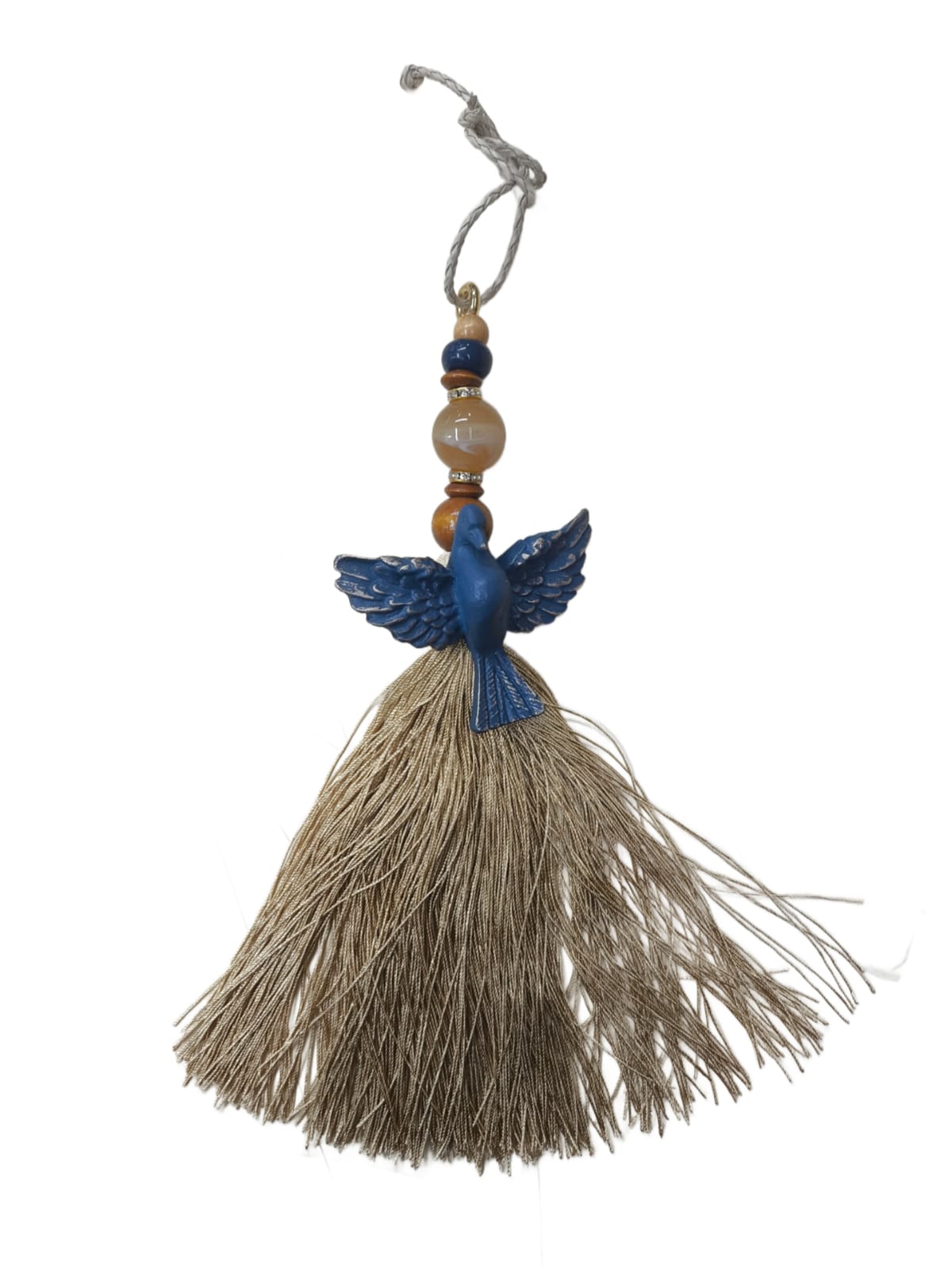 Adorno delicado com pombinha do Divino Espírito Santo em tom azul, acompanhada de tassel dourado. Perfeito para decorar ambientes com fé e sofisticação, seja em portas, paredes ou espaços de oração, trazendo paz e beleza ao seu lar.
