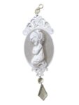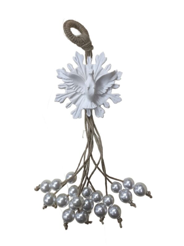 Adorno com a imagem do Divino Espírito Santo no estilo resplendor, decorado com pérola e detalhes em rami. Perfeito para decorar espaços de oração, portas ou cantinhos especiais, trazendo fé e elegância ao ambiente.