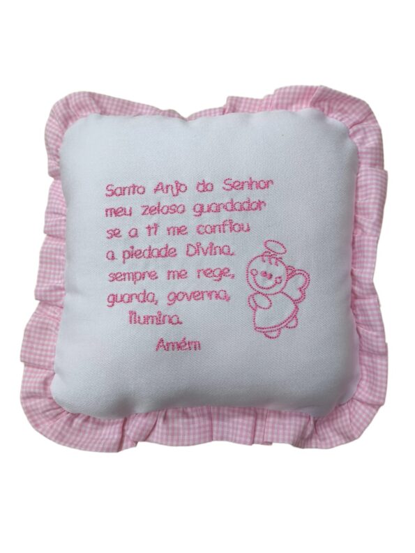 Almofada artesanal confeccionada em 100% algodão na cor rosa, medindo 20 cm. Estampada com a bela oração do Santo Anjo, é perfeita para decorar ambientes com fé e proteção. Ideal para presentear ou ter em casa como um lembrete do cuidado e intercessão divina no dia a dia.