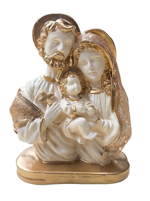 O Busto da Sagrada Família em gesso 18 cm bege representa Jesus, Maria e José, simbolizando amor, união familiar e fé. O acabamento em tons bege confere delicadeza e destaque à peça.