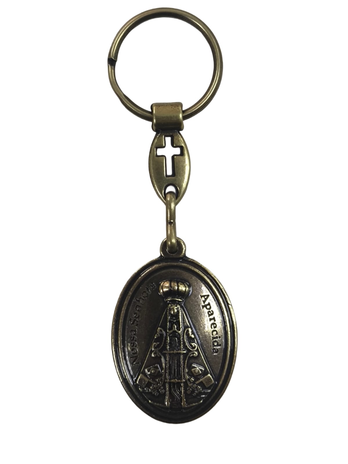 Chaveiro com medalha oval de Nossa Senhora Aparecida, com acabamento em metal no estilo ouro velho. Uma peça elegante e cheia de significado, perfeita para carregar junto às chaves, bolsas ou mochilas.