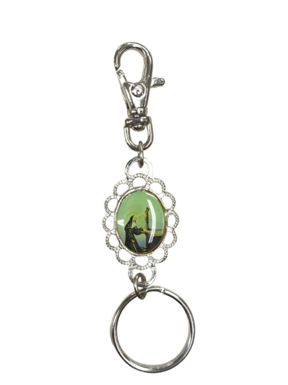 Chaveiro em metal resistente com a imagem de Santa Rita, conhecida como a padroeira das causas impossíveis e da perseverança. Uma peça devocional ideal para quem busca fé e esperança no dia a dia.