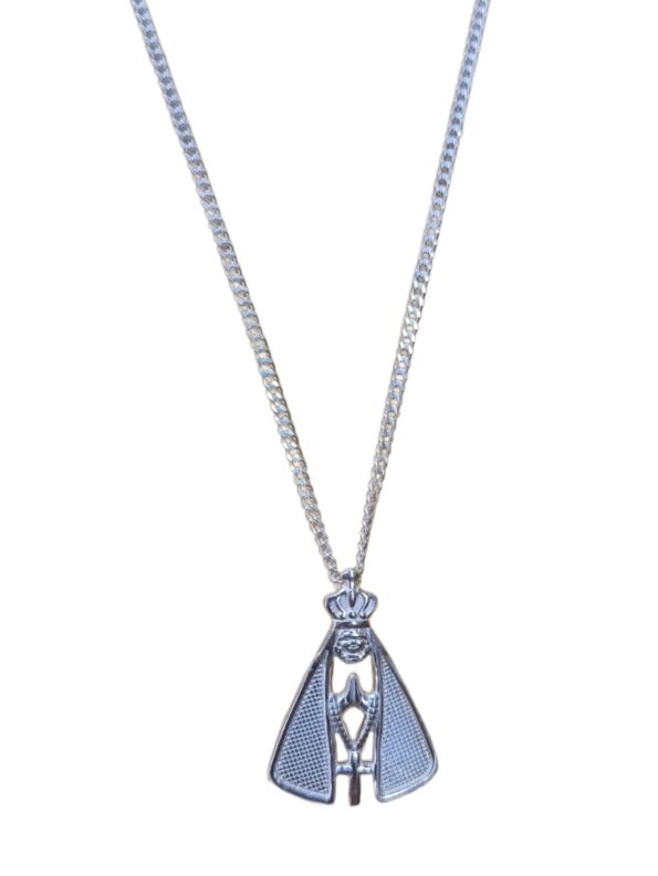 Colar em prata 925 com pingente de nossa senhora Aparecida em estilo vazado. Este colar combina leveza e elegância, sendo uma peça moderna e cheia de espiritualidade para o dia a dia ou ocasiões especiais.