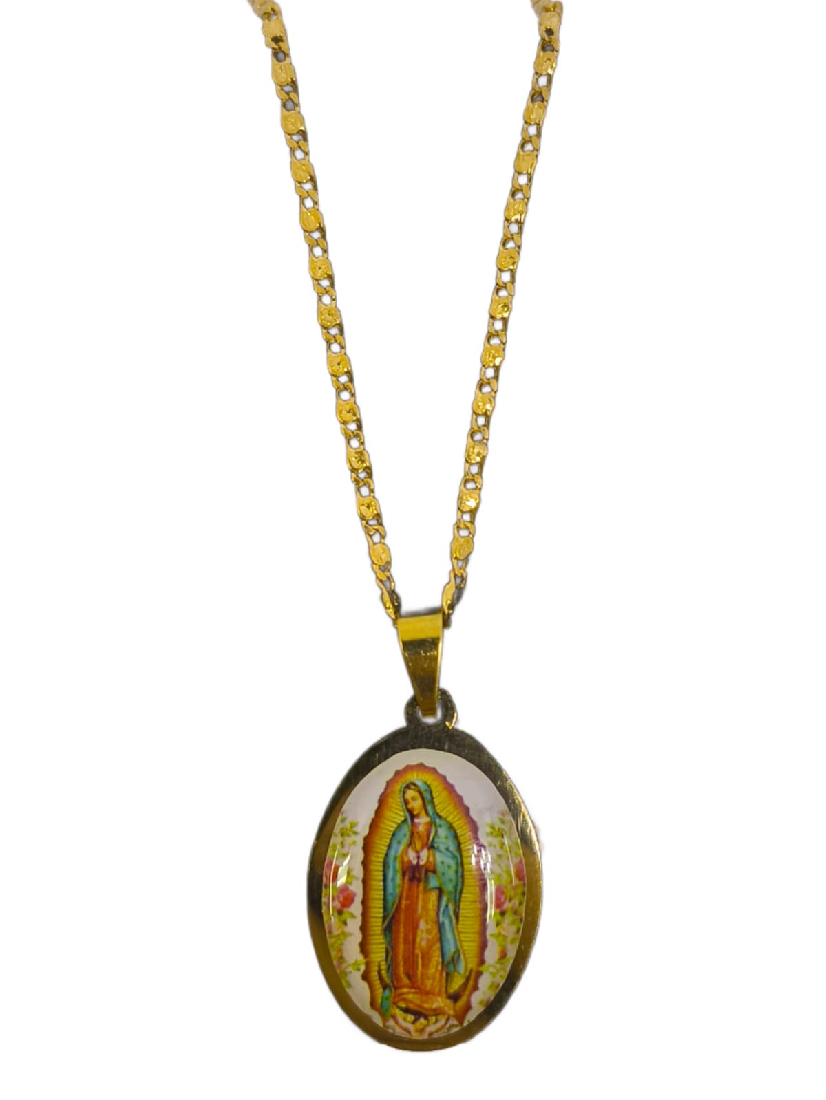Uma peça imponente de fé e devoção. O colar folheado Guadalupe grande traz a imagem de Nossa Senhora de Guadalupe com detalhes marcantes, simbolizando proteção e espiritualidade. Ideal para quem deseja expressar sua fé com sofisticação e estilo.