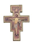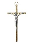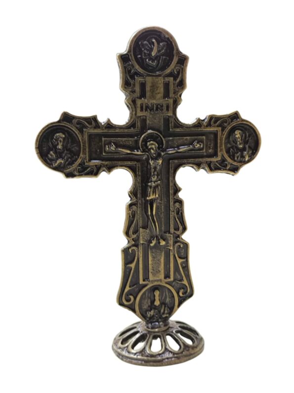 Este crucifixo de mesa em metal com acabamento ouro velho é uma peça compacta e elegante de 10 cm, perfeita para oratórios, mesas de trabalho ou decoração religiosa em qualquer ambiente.