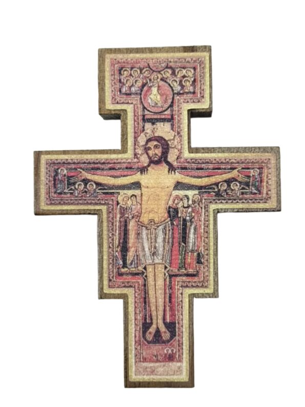 Este crucifixo em madeira segue o modelo da Cruz de São Damião, conhecida também como Cruz de São Francisco de Assis. A cruz é uma obra de arte pintada no século XII por um monge siríaco na região da Úmbria, na Itália, e ficou famosa por ser o local onde São Francisco recebeu a chamada de Deus para reconstruir a Igreja.