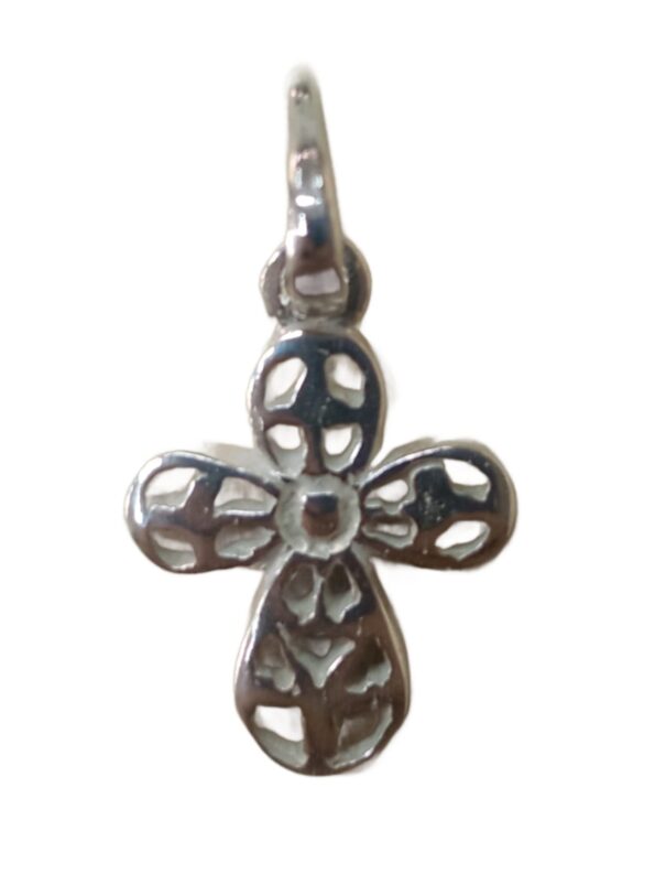 Cruz delicada em prata 925 com design vazado, perfeita para quem busca um símbolo de fé discreto e elegante. Ideal para compor colares ou escapulários, trazendo leveza e sofisticação ao seu uso diário.