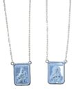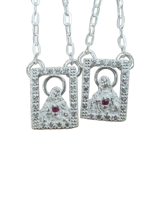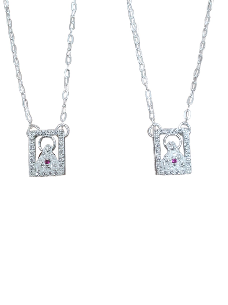 Este escapulário especial em prata 925 possui medalhas de Nossa Senhora do Carmo e do Sagrado Coração de Jesus, adornadas com delicados strass rosa. A corrente de 60 cm combina sofisticação e devoção, tornando essa joia uma opção única para expressar sua fé com estilo.