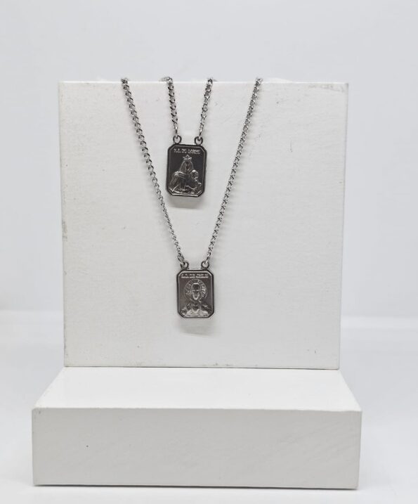 Este escapulário de aço inoxidável, com 70 cm de comprimento, apresenta as medalhas de Nossa Senhora do Carmo e do Sagrado Coração de Jesus, dois grandes símbolos de fé e proteção.