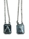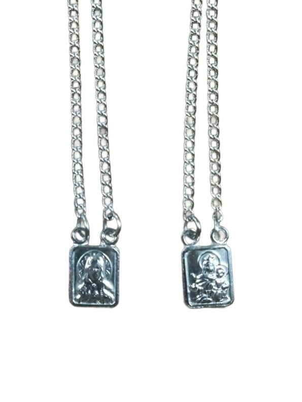 Este escapulário de aço inoxidável, com 60 cm de comprimento, apresenta as medalhas de Nossa Senhora do Carmo e do Sagrado Coração de Jesus, dois grandes símbolos de fé e proteção.