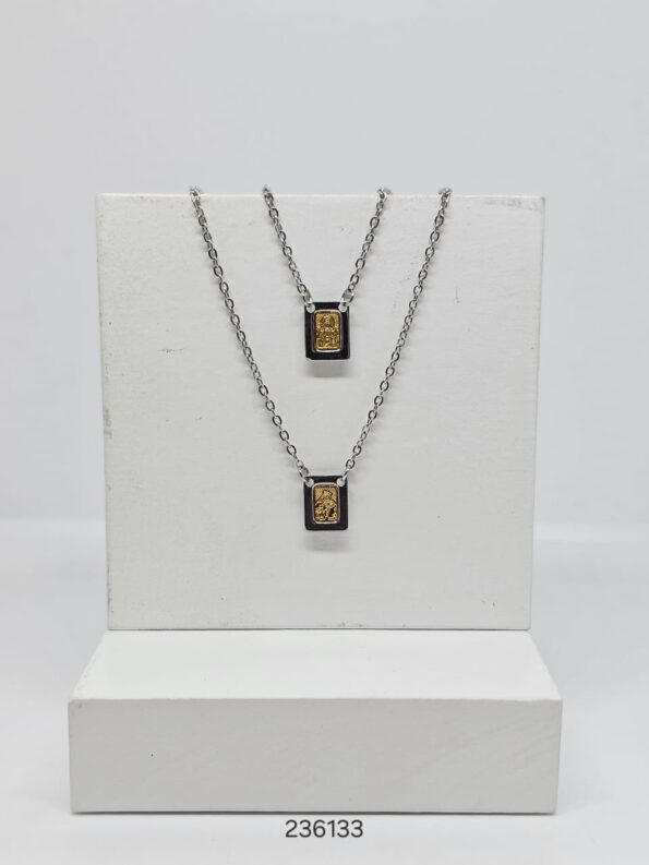 Este belíssimo escapulário de aço dourado, com 60 cm de comprimento, apresenta as medalhas de Nossa Senhora do Carmo e do Sagrado Coração de Jesus, símbolos de devoção e proteção.