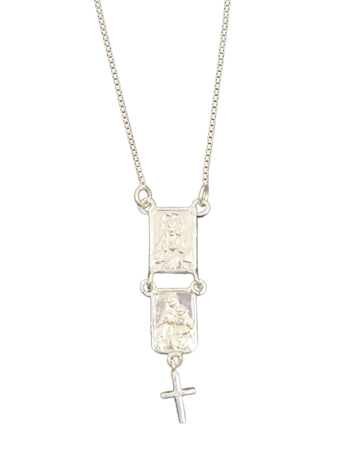 Este delicado escapulário em prata 925 une tradição e estilo em uma peça elegante e cheia de fé. Com formato de gargantilha e detalhe de cruz, representa a devoção ao Sagrado Coração de Jesus e à Nossa Senhora do Carmo, símbolos de proteção espiritual e entrega a Deus.
