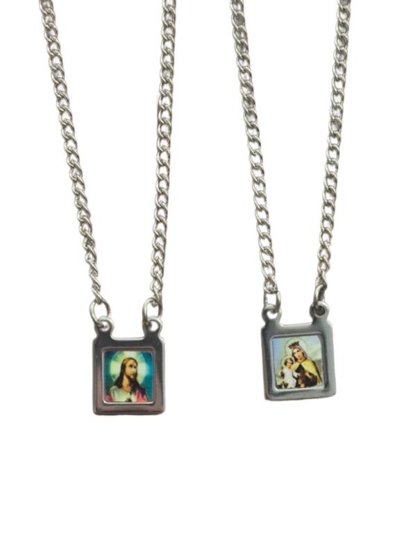 As medalhas em formato quadrado são produzidas em aço inox, garantindo resistência, durabilidade e conforto para o uso diário. Os detalhes coloridos realçam a beleza das imagens sagradas, tornando o escapulário ainda mais especial e expressivo.