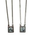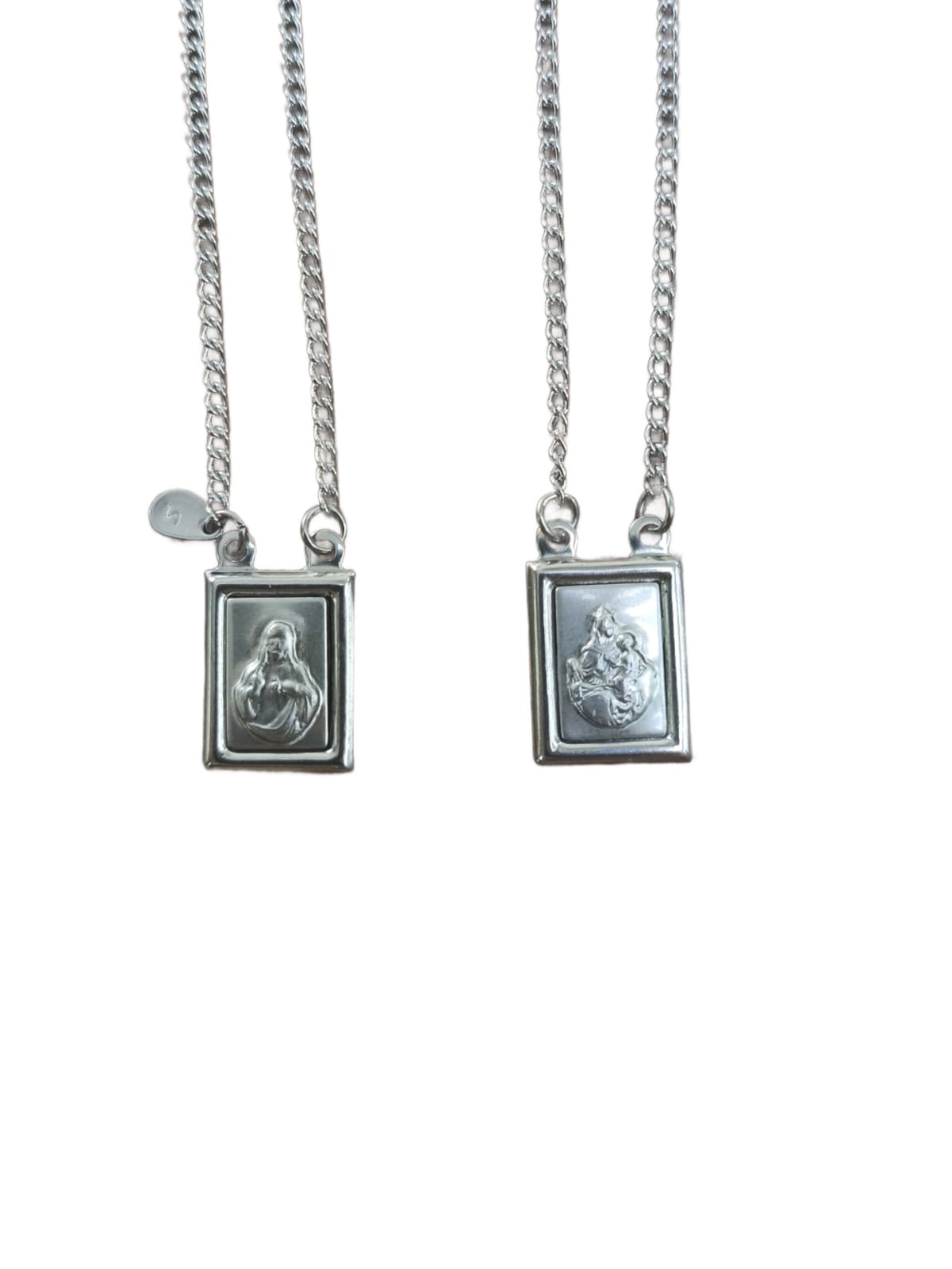 Este escapulário de aço inoxidável, com 60 cm de comprimento, apresenta as medalhas de Nossa Senhora do Carmo e do Sagrado Coração de Jesus, dois grandes símbolos de fé e proteção.