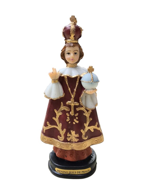 A Imagem do Menino Jesus de Praga em resina 15 cm representa o Menino Jesus como símbolo de proteção, bênçãos e devoção, conhecido por atender aos pedidos de fé de seus devotos.