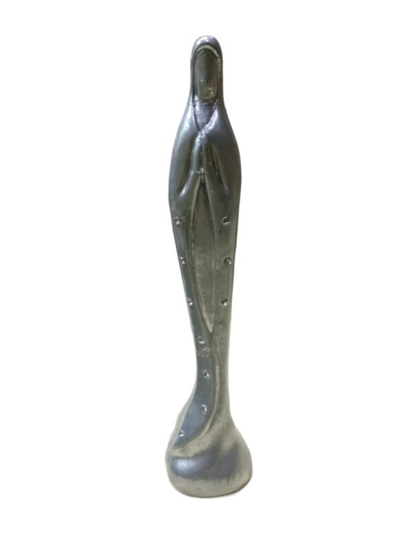 Com um acabamento prateado que realça a beleza e a simplicidade de Maria, esta peça de 30 cm é perfeita para altares, capelas ou espaços de meditação. Sua elegância e tranquilidade são ideais para aqueles que buscam um ícone de inspiração e reflexão.