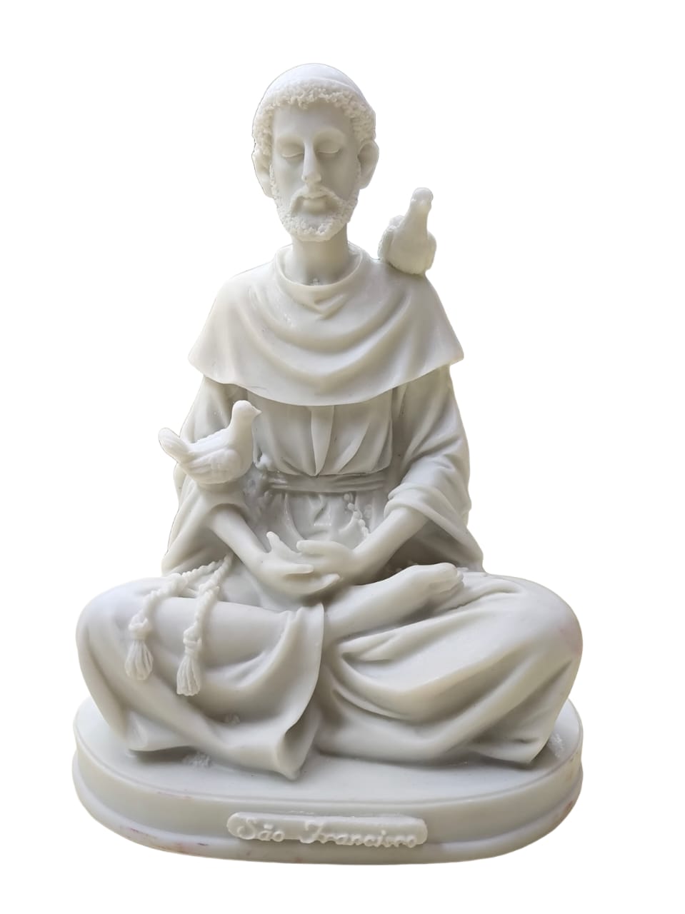 A imagem de São Francisco Meditando em resina branca 20 cm representa o santo em momento de profunda oração e contemplação, símbolo de humildade, simplicidade e amor à natureza.