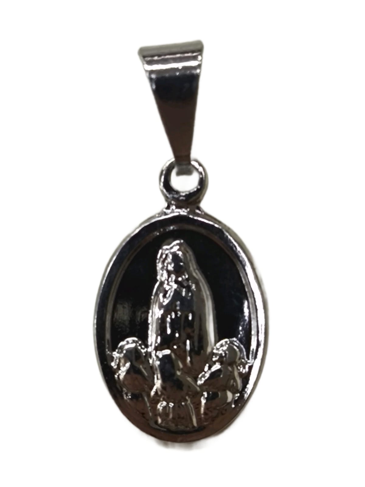 Medalha em aço inoxidável com a imagem de Nossa Senhora de Fátima, no formato oval e tamanho pequeno. Uma peça delicada e simbólica, perfeita para devoção diária e proteção.
