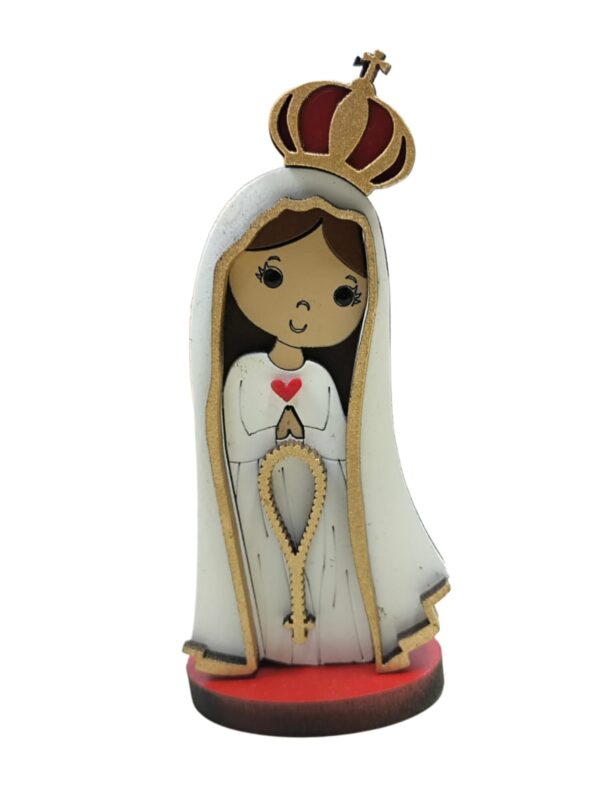 Esta linda imagem de Nossa Senhora de Fátima é feita em MDF, com 10 cm de altura, perfeita para pequenos oratórios, mesas ou lembranças religiosas. Representa a mãe que intercede por seus filhos, símbolo de fé, esperança e amor.