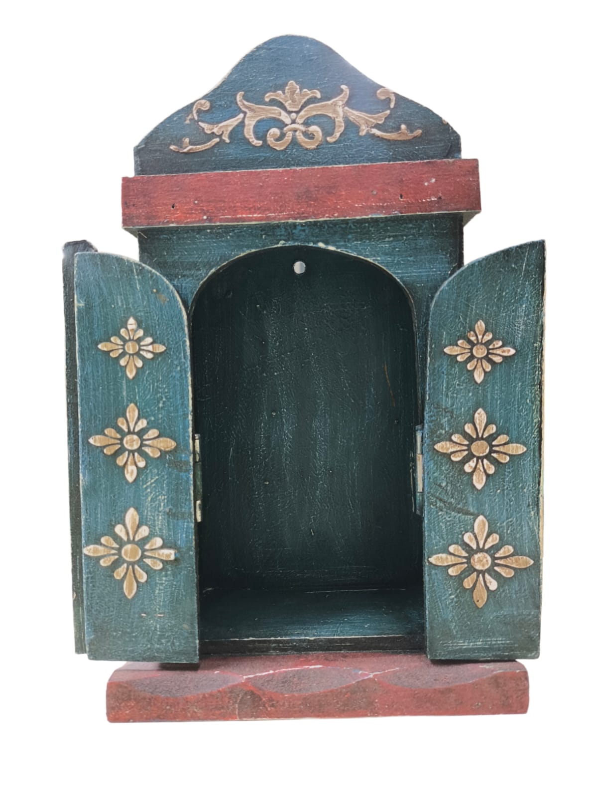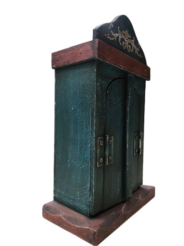 Oratório com porta em madeira no estilo barroco, pintado em azul com detalhes vermelhos. Indicado para acomodar imagens de até 15 cm. Produzido em madeira, possui acabamento artesanal com portas que se abrem e fecham, oferecendo um espaço especial para oração e devoção. Ideal para uso em altares ou decoração religiosa.