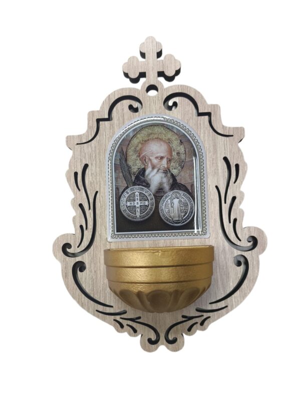 A pia de água benta – São Bento (MDF) é um item religioso perfeito para quem deseja trazer proteção e bênçãos para o lar. Feita em MDF de alta qualidade, possui um design detalhado com a tradicional medalha de São Bento, símbolo de fé e proteção contra o mal. Ideal para ser fixada na parede, é uma peça funcional e decorativa, além de ser um presente especial para devotos de São Bento.