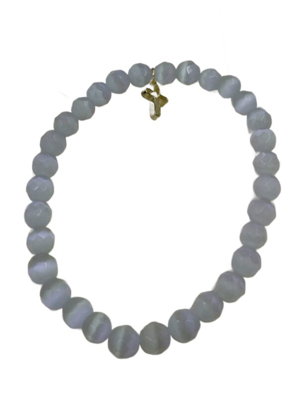 Esta pulseira folhada a ouro 18k é uma peça refinada e elegante, adornada com pedras de olho de gato branco, que refletem a luz com um brilho suave e encantador.