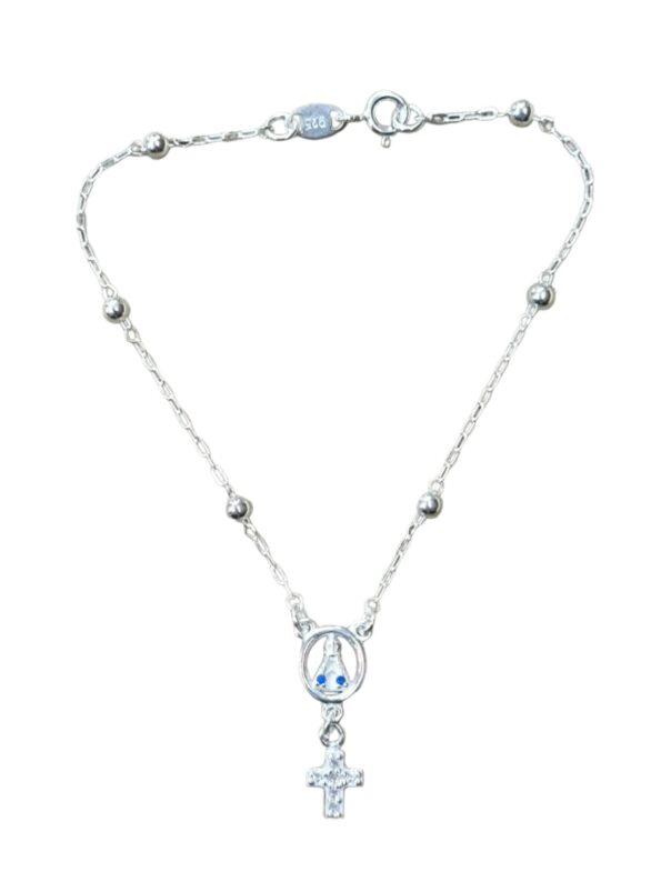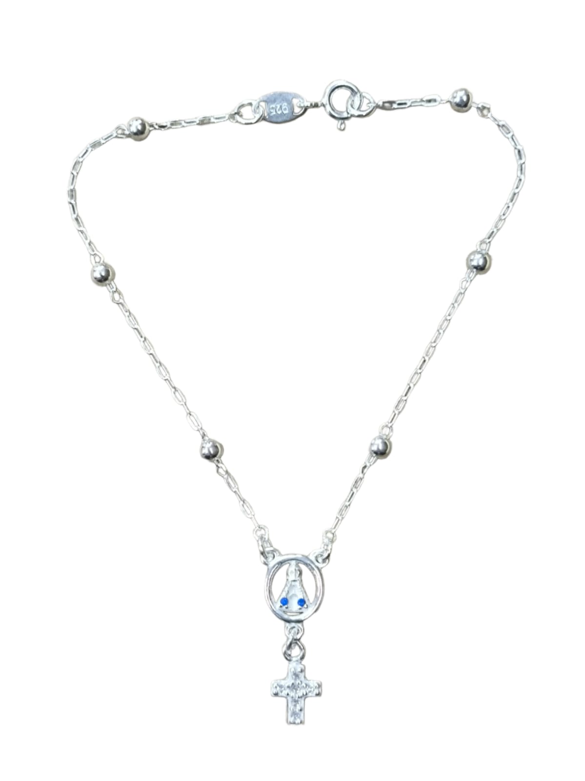 Pulseira em prata 925 delicada que combina símbolos de fé: pingente de terço, medalha de Nossa Senhora Aparecida e cruz. Uma joia cheia de significado, perfeita para quem deseja demonstrar devoção e proteção no dia a dia.