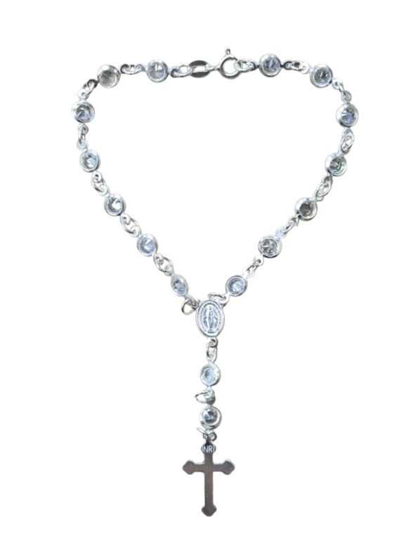 Pulseira delicada em prata 925 com pingente de terço adornado por detalhes em strass brilhante, unindo fé e elegância em um único acessório. Ideal para quem busca uma joia que represente devoção com um toque moderno e sofisticado.