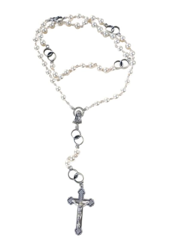 Este terço elegante apresenta pérolas brancas, simbolizando pureza e serenidade, combinadas com uma corrente dourada que confere um toque de sofisticação. As alianças representam a união, e a medalha de Nossa Senhora Madona, padroeira da proteção e intercessão, torna este terço uma escolha perfeita para abençoar o casamento, oferecendo um elo espiritual durante a cerimônia.