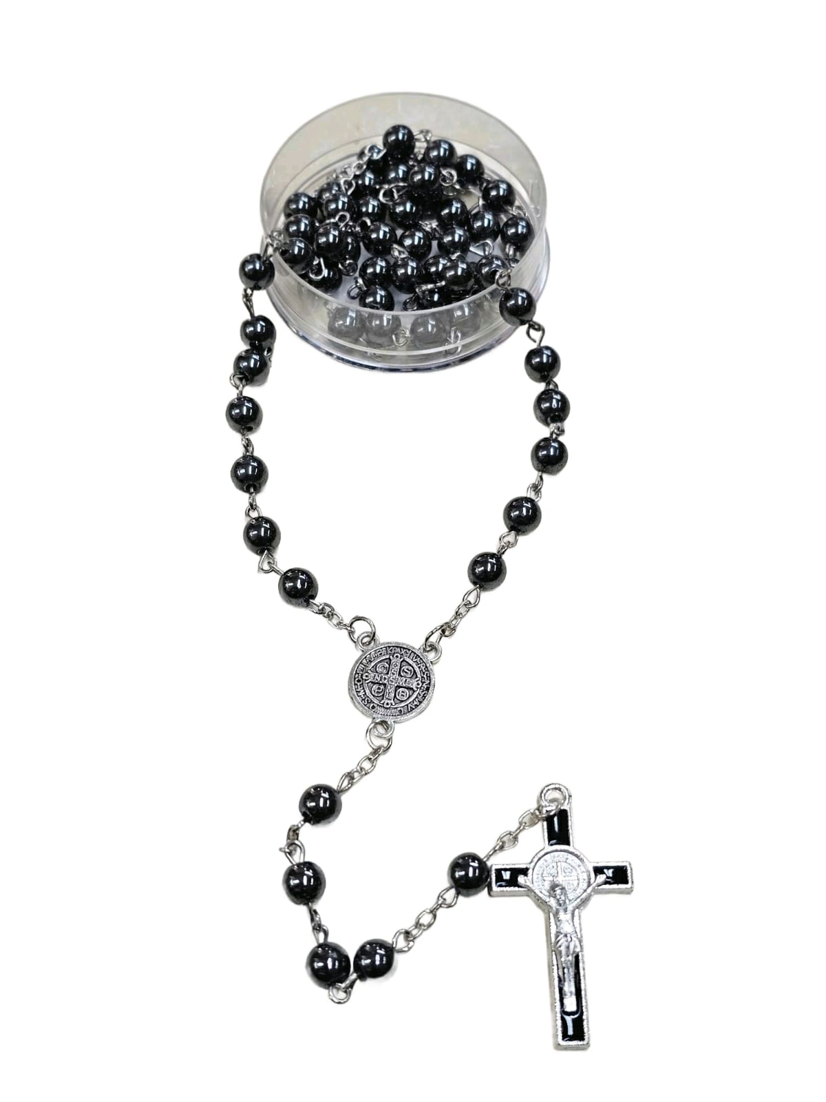Com contas de hematita e um fecho seguro, este terço é dedicado a São Bento. A hematita, conhecida por suas propriedades protetoras, torna este terço uma peça especial para quem busca proteção espiritual.