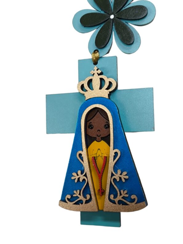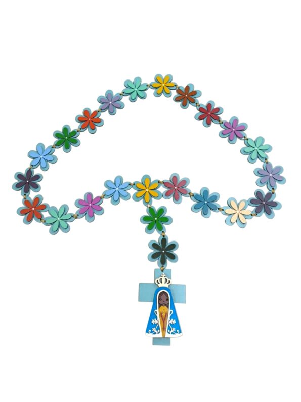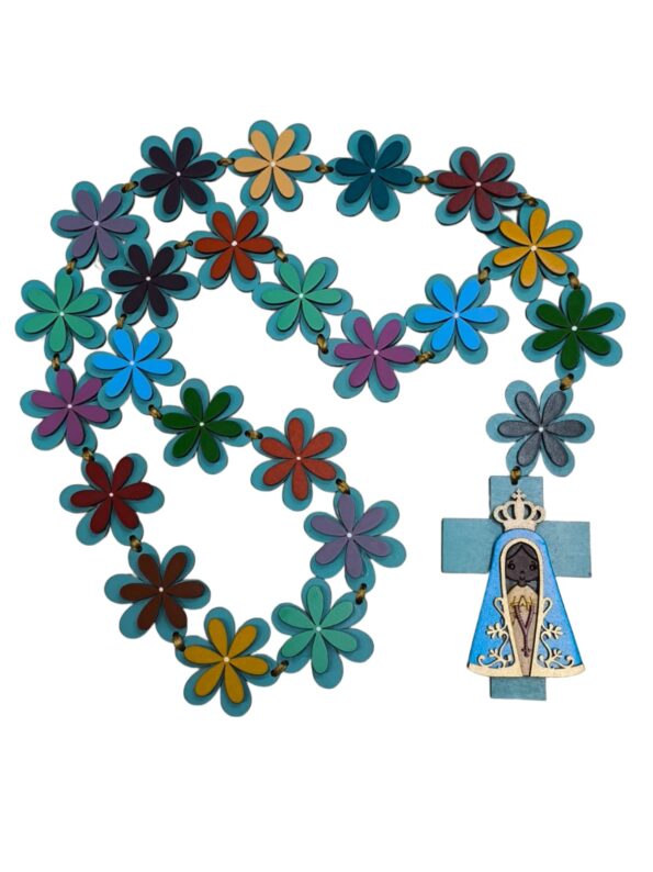 Este terço de parede é feito em MDF colorido e decorado com flores, combinando fé e delicadeza em uma peça encantadora. Ideal para oratórios, quartos ou qualquer ambiente que deseja transmitir espiritualidade com um toque de cor e beleza.