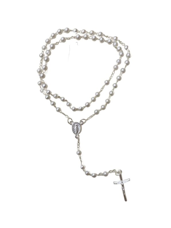 Com contas suaves em tom de creme perolado (não são pérolas verdadeiras), este terço é uma opção elegante e discreta para quem deseja rezar com delicadeza e devoção. Ideal para uso diário ou como lembrança religiosa.